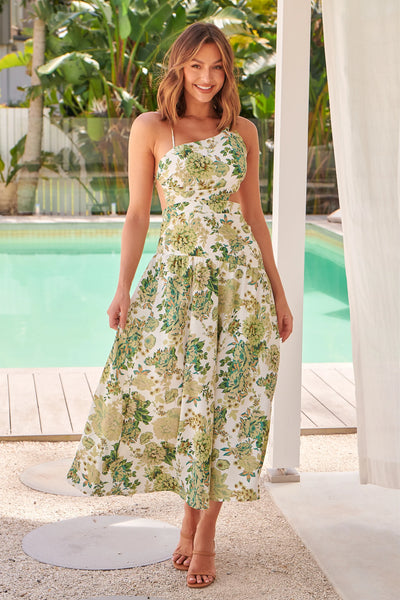 Faye Mustard/Pink/Green Leaf Print Open Back Tiered Dress