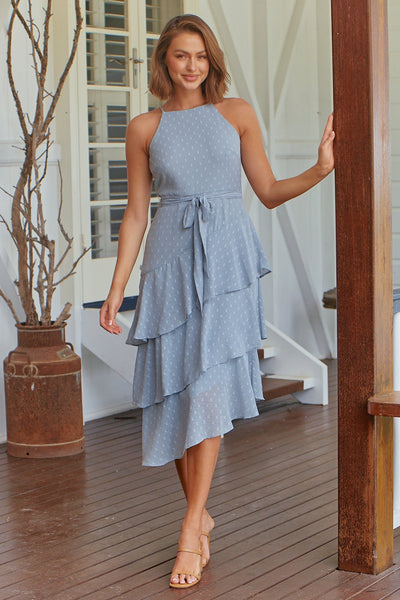 Kitty Chiffon Grey Sage Tierred Ruffle Evening Dress