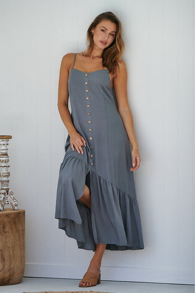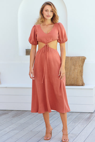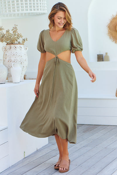 Raquel Frill shoulder Shirred Bust Khaki Midi Dress