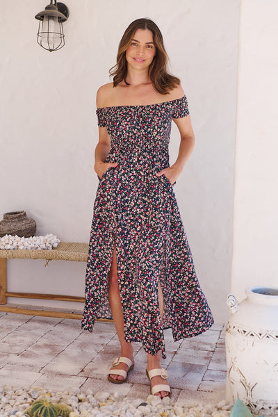 Saskia Black/Blue Floral Print Cap Sleeve Midi Dress