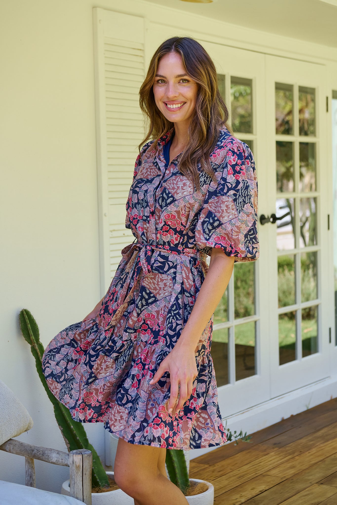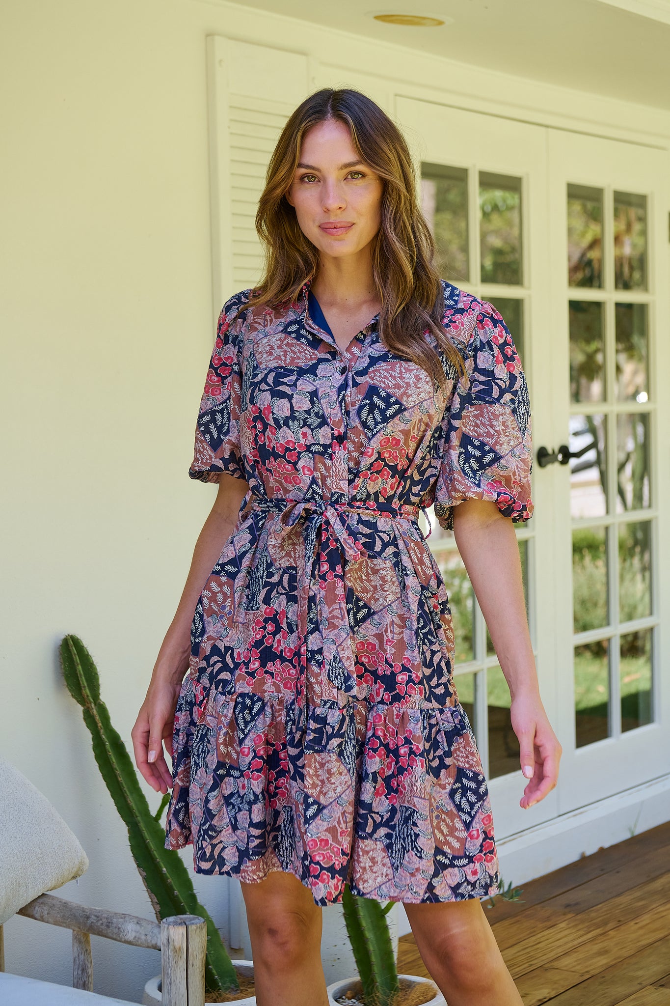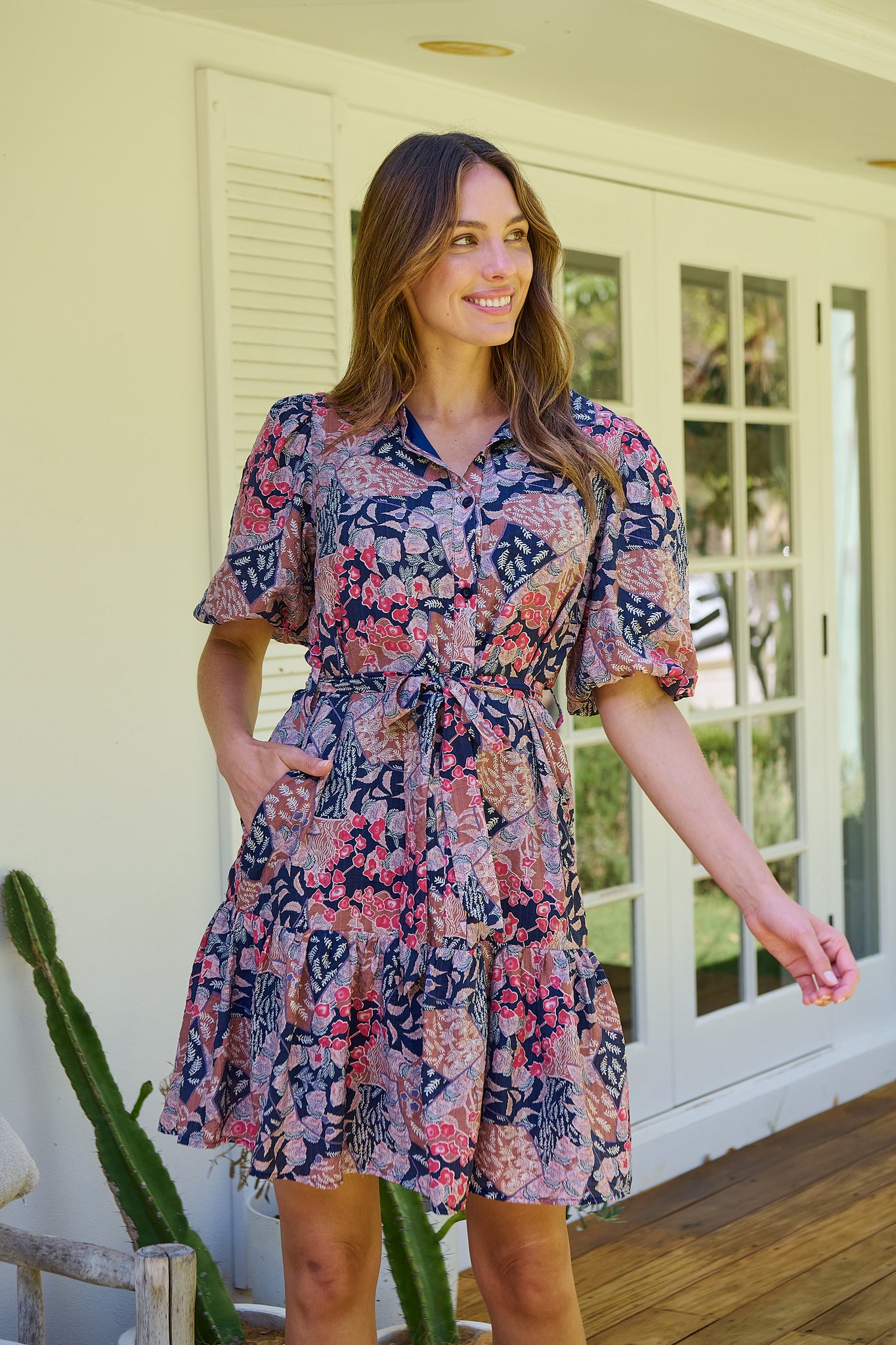 Amanda Navy/Maroon/Brown Floral Print Bell Sleeve Collared Dress