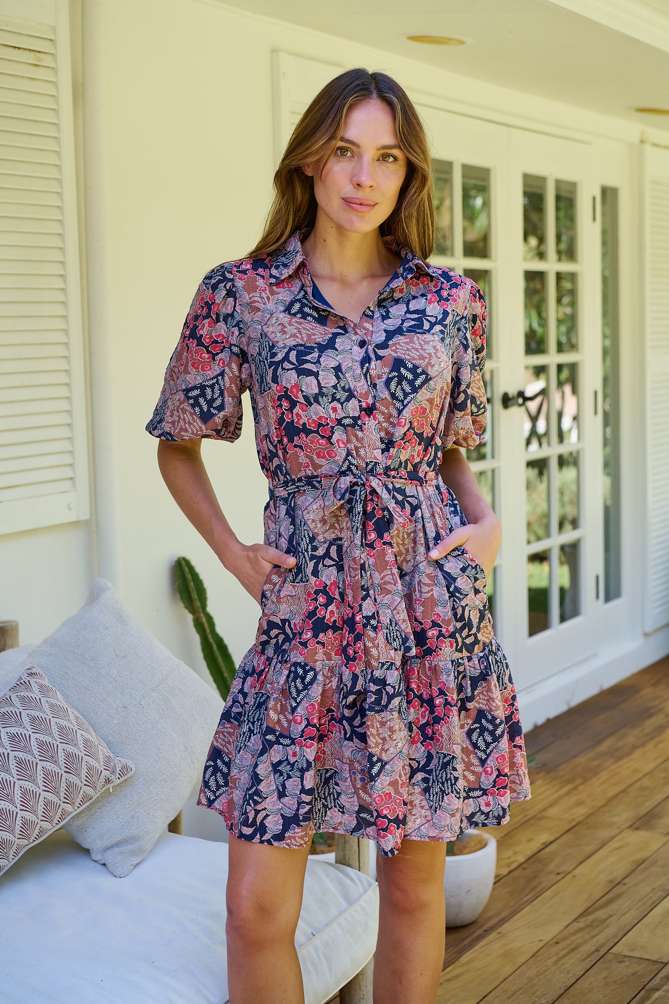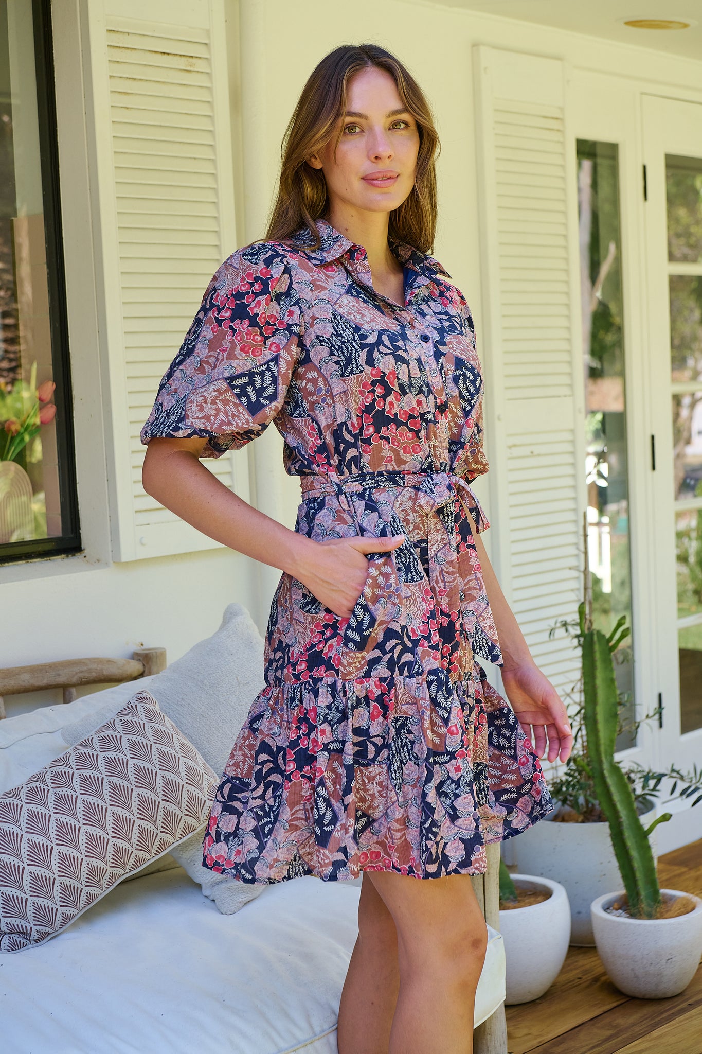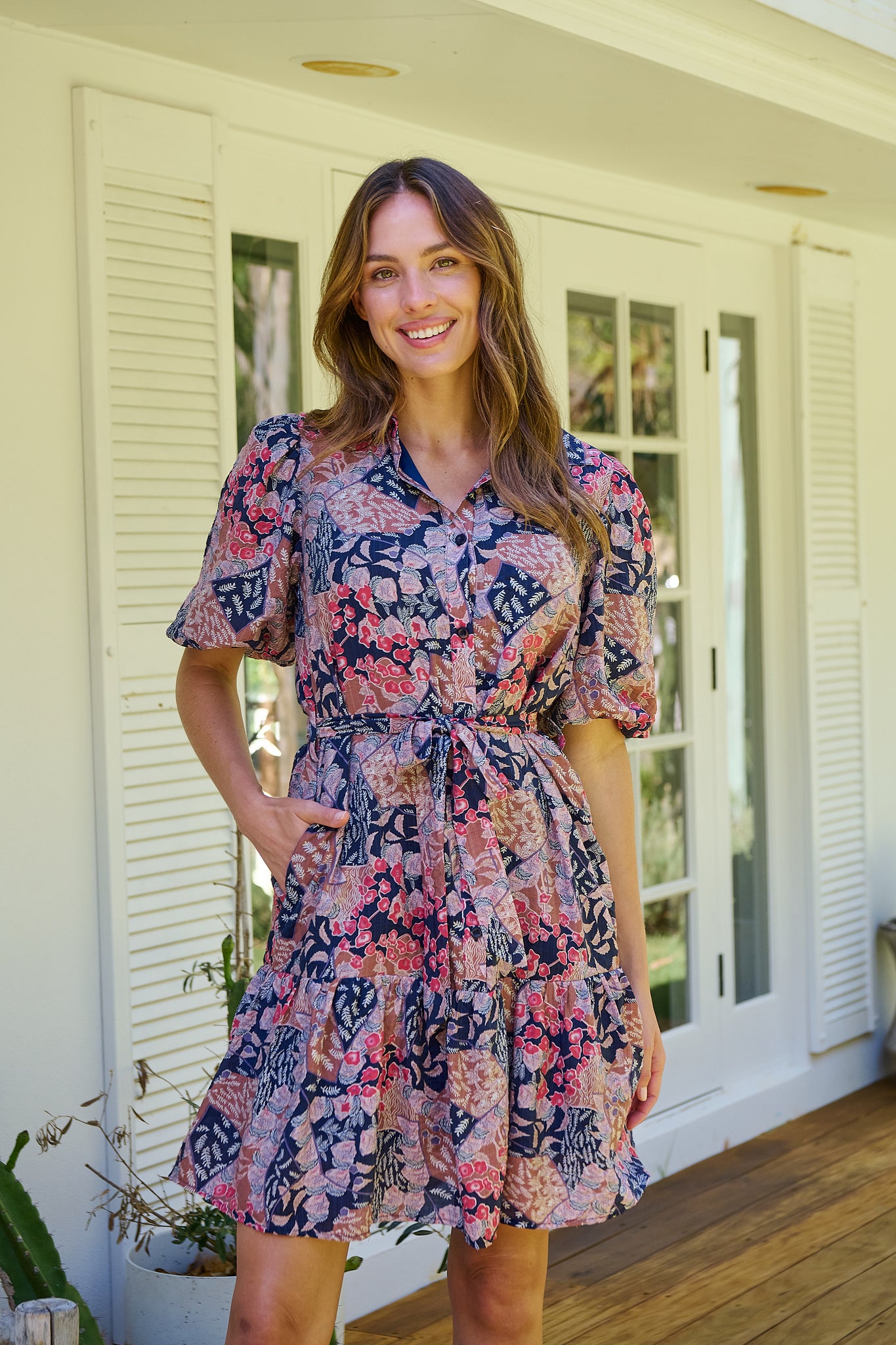 Amanda Navy/Maroon/Brown Floral Print Bell Sleeve Collared Dress