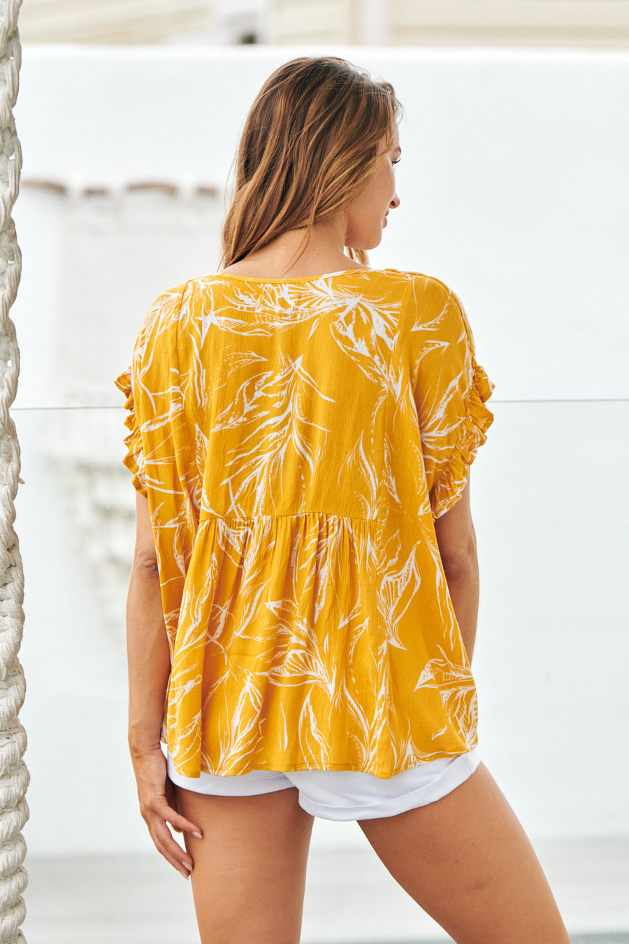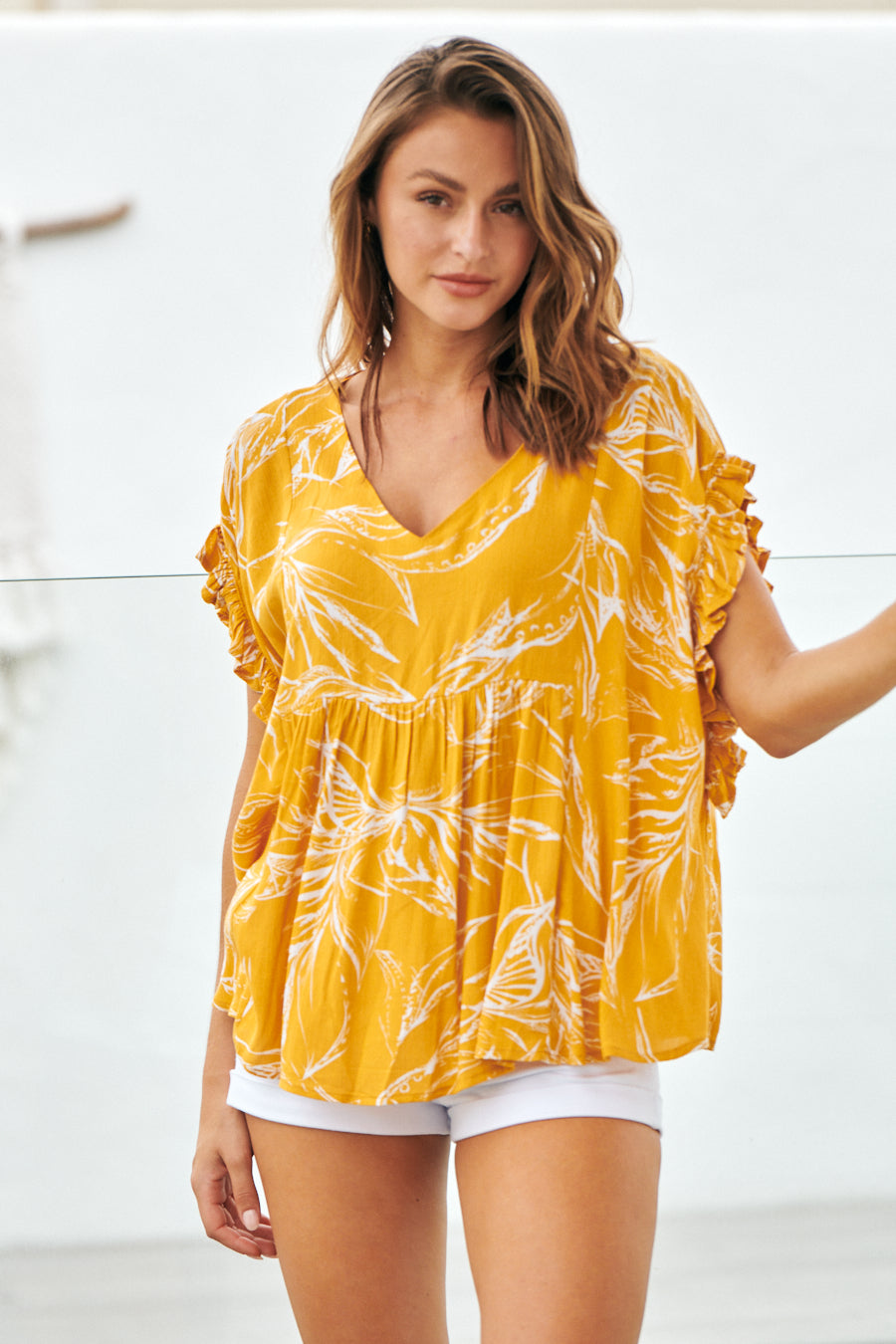 Bright cheerful and sunny this beautiful light weight top is cool to wear both in temperature and style. Worn with white or many of the current browns and ambers it presents a stunning look for any event.